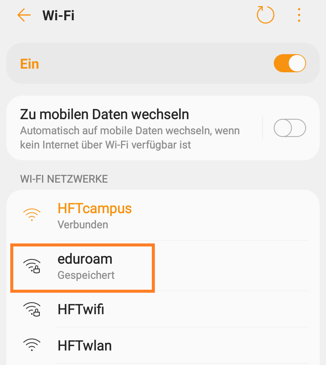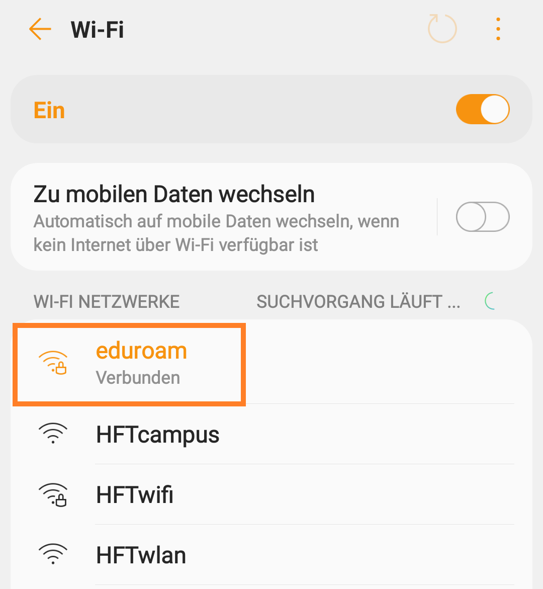 Wenn Sie aktuell mit "Eduroam" verbunden sind, bleiben Sie lange auf dem Icon um die WLAN Einstellungen zu öffnen.